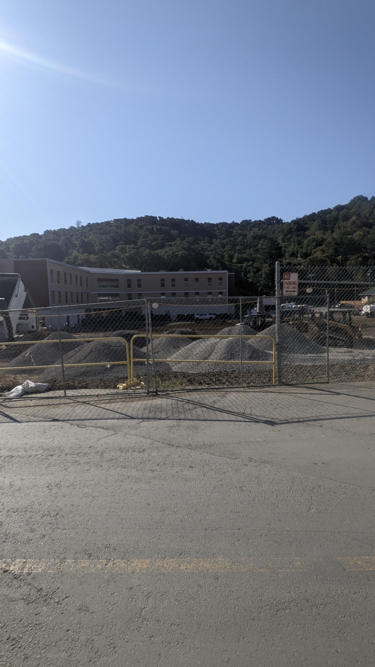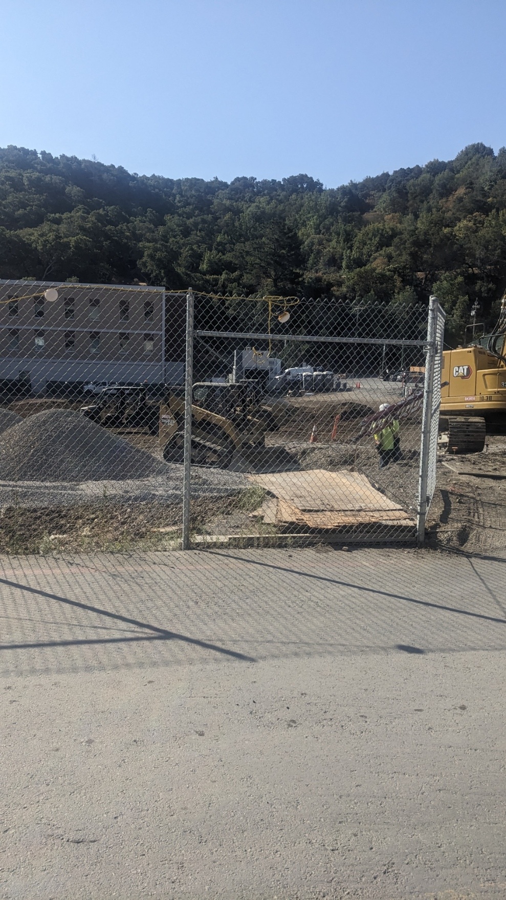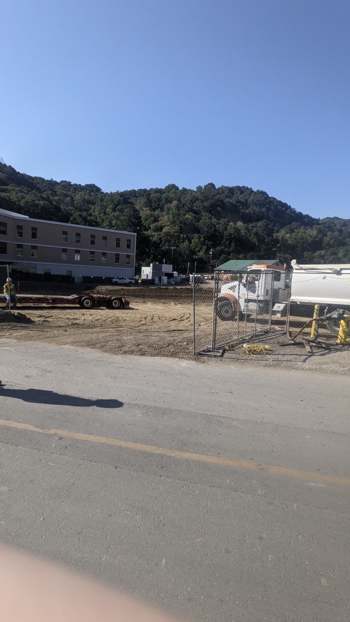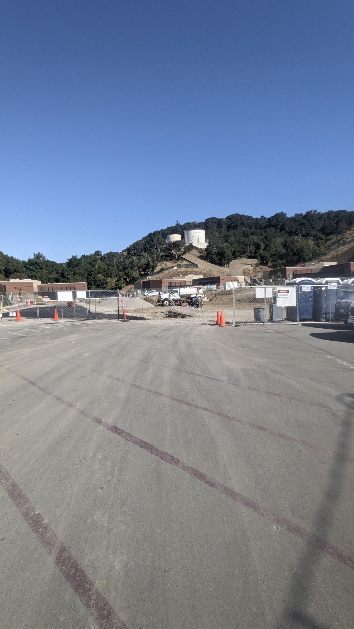 The photo presents a classic construction site scene. The clear, sunny sky over the landscape hints at a project in its early stages. Notice the fencing, safety cones, and portable toilets โ all hallmarks of a modern construction site, seen frequently on threads in r/Construction or r/Tools. The trucks and equipment parked off to the side tell the story of a multi-faceted project; perhaps in r/Plumbing we see the water truck is ready to go to the next phase of the project.